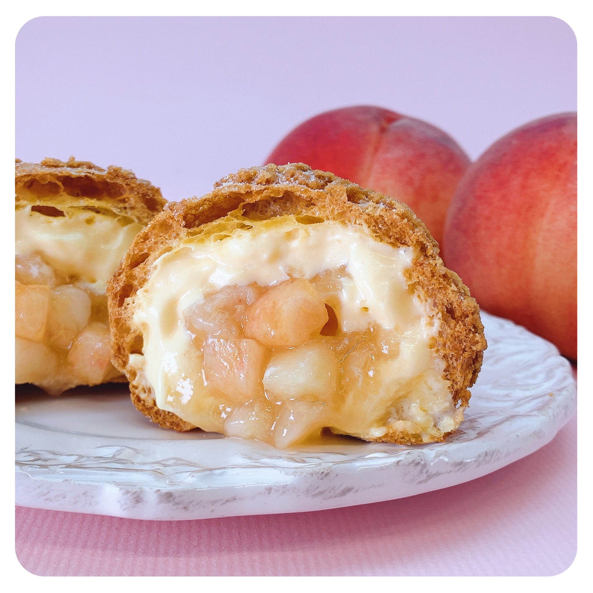 瑞々しい桃のマリネを詰め込んだ、フレッシュなシュークリームです。